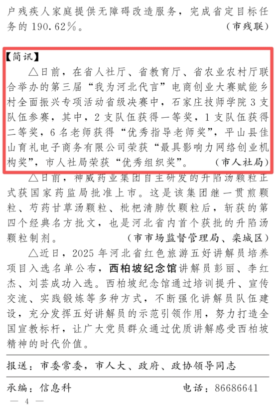 昨天,《石家庄在行动》刊发两篇石家庄技师学院办学成绩,一是“工学一体化”培养模式取得积极成效,二是我院3支参赛队在第三届全省电商创业大赛囊括前三名的优异成绩!