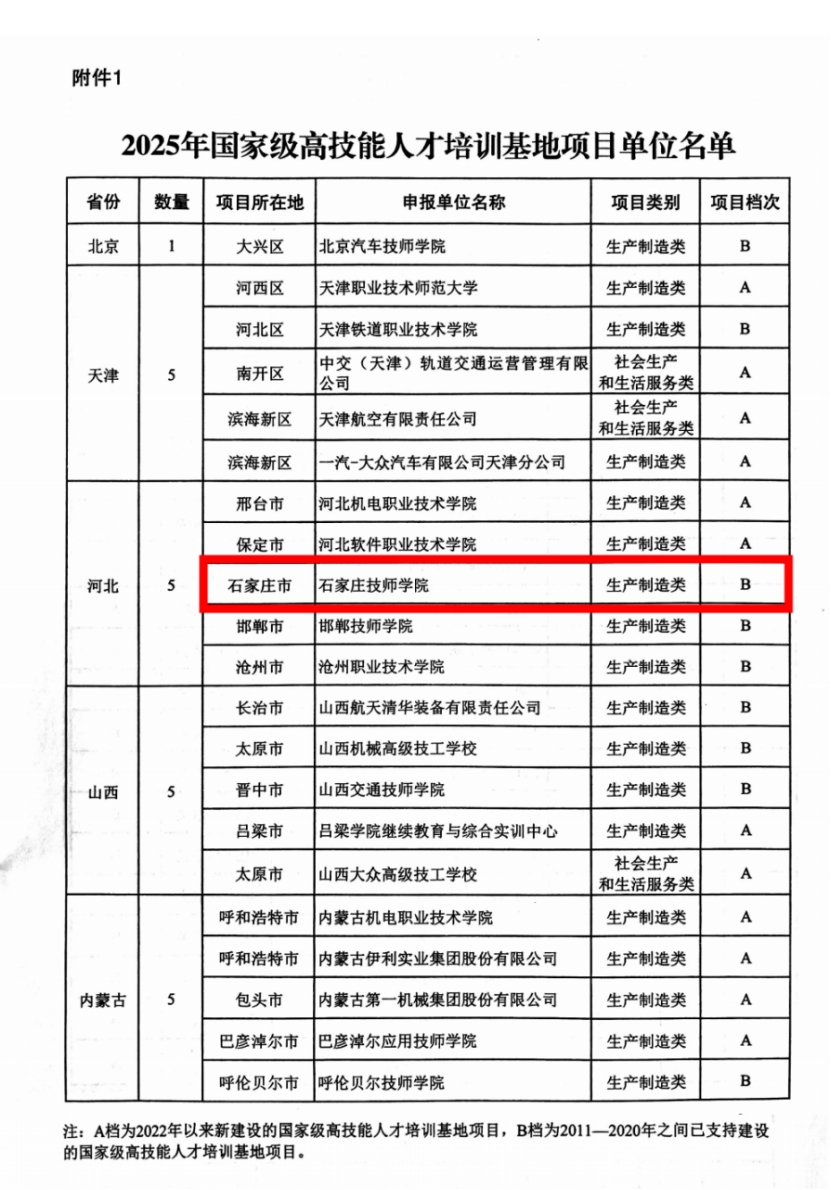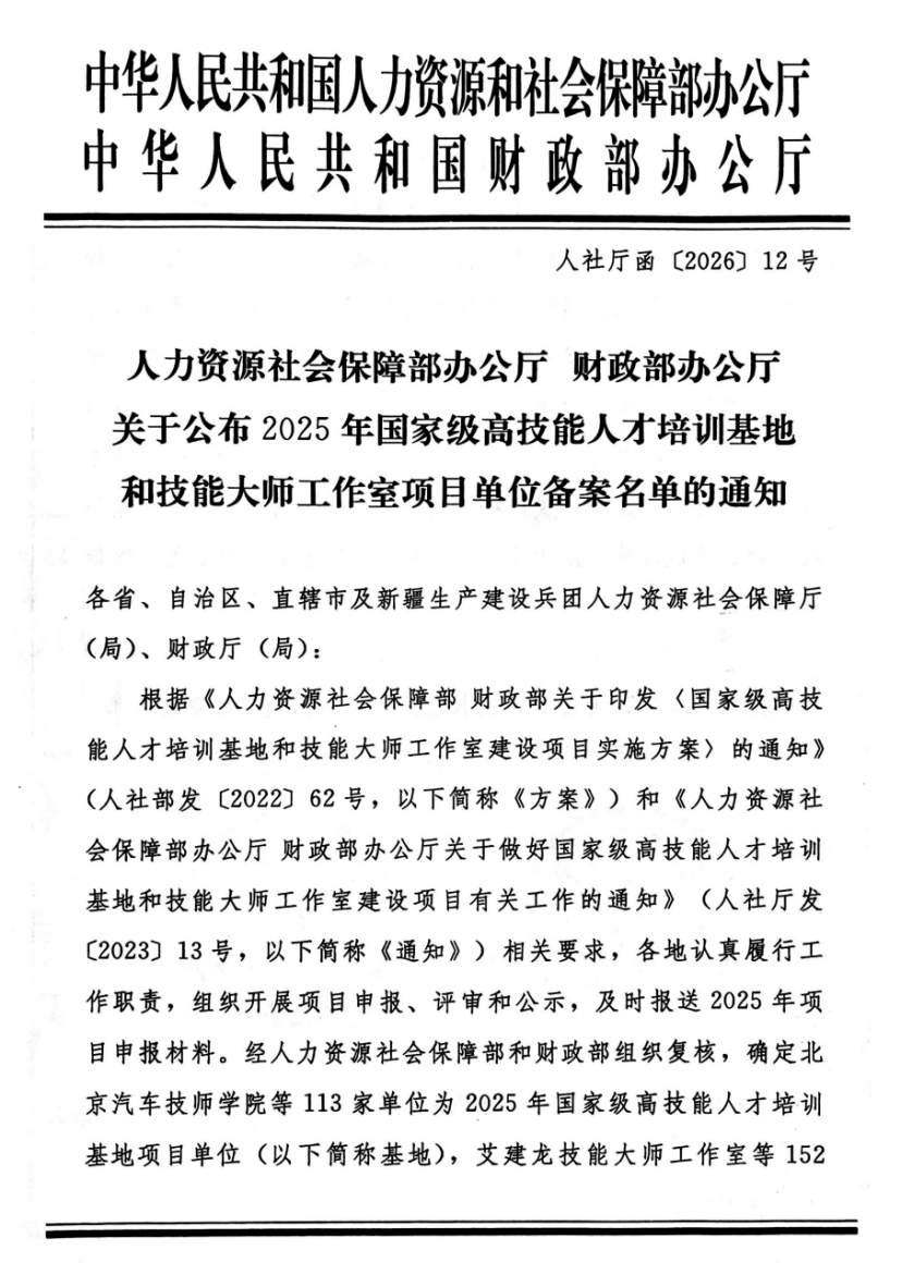 近日,人力资源社会保障部办公厅、财政部办公厅联合发布《关于公布2025年国家级高技能人才培训基地和技能大师工作室项目单位备案名单的通知》(人社厅函〔2026〕12号),石家庄技师学院成功入选2025年国家级高技能人才培训基地项目单位,这是学院第三次获批该国家级资质,标志着学院在高技能人才培养领域的办学实力与示范引领作用再次获得国家层面的高度认可。