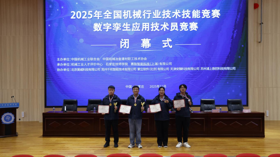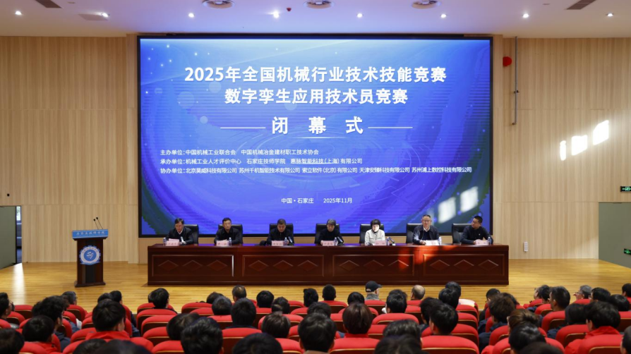 2025年11月14日至16日,由中国机械工业联合会、中国机械冶金建材职工技术协会主办,中国机械工业联合会机械工业人才评价中心、石家庄技师学院、惠脉智能科技(上海)有限公司联合承办的2025年全国机械行业技术技能竞赛——数字孪生应用技术员竞赛在河北石家庄技师学院圆满落幕。中国机械工业联合会原副会长、全国机械职业教育教学指导委员会主任委员、机械工业人才评价专家库顾问专家于清笈,中国机械工业联合会机械工业人才评价中心副主任孙颐、技能发展处处长王铁印,石家庄市人力资源和社会保障局党组成员、副局长谢富强及石家庄技师学院党委书记宋志宏等领导出席开、闭幕式,仪式由石家庄技师学院院长方建京主持。